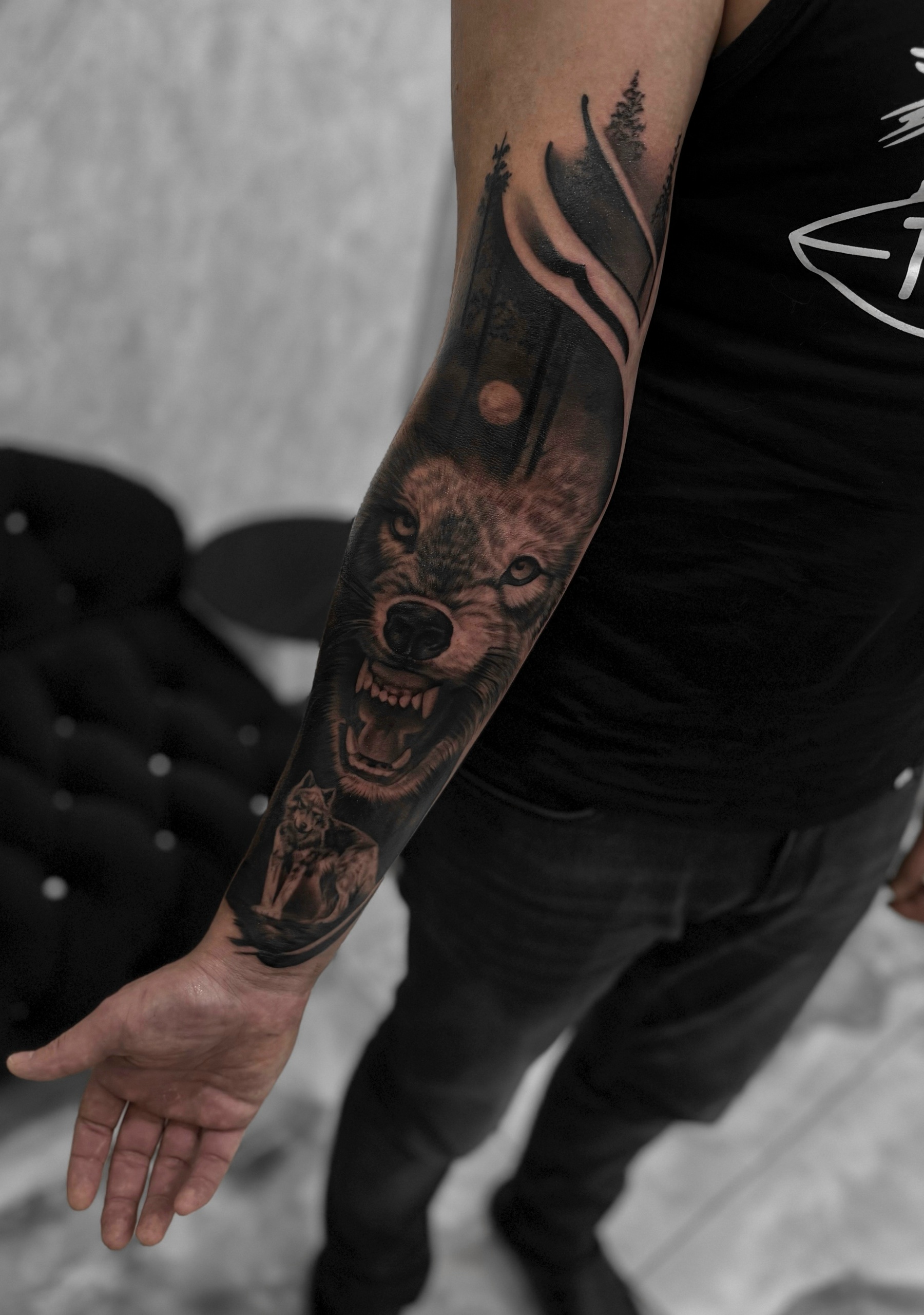 – Медведь на предплечье (между локтем и запястьем) 10×15 см